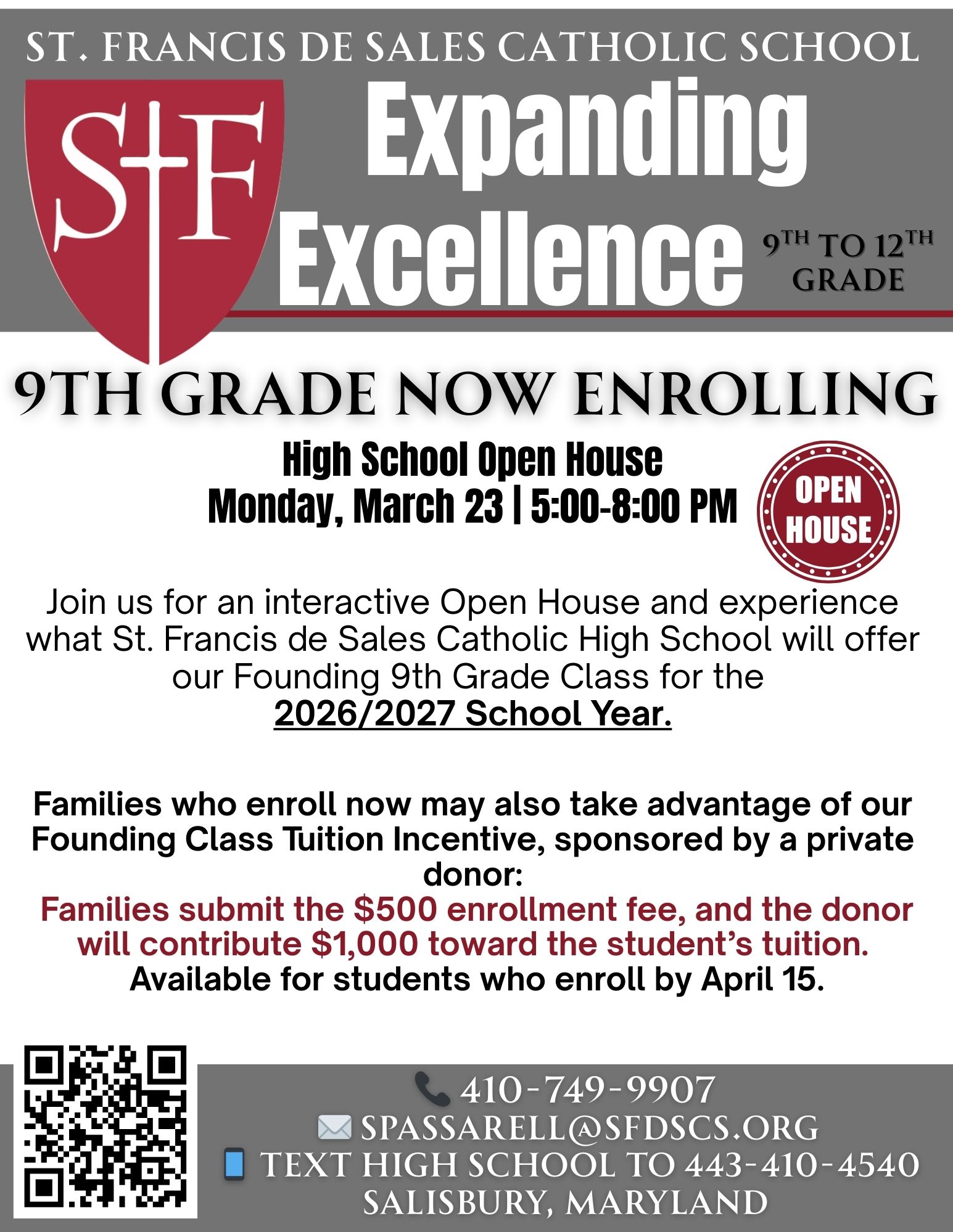 St. Francis de Sales Catholic School is proud to announce the launch of St. Francis de Sales Catholic High School, beginning with our Founding 9th Grade Class in Fall 2026.